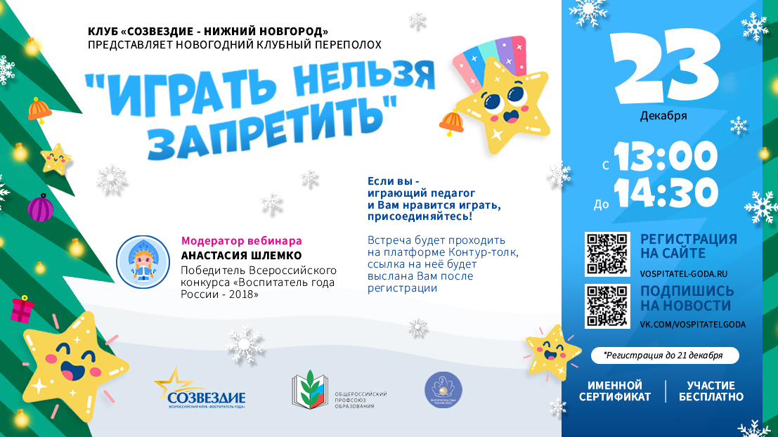 Если Вы - педагог дошкольной образовательной организации и игра - ведущий вид деятельности у Ваших воспитанников, тогда Вам необходимо присоединиться к Новогоднему переполоху по теме "Играть нельзя запретить", который пройдёт 23 декабря в 13.00.